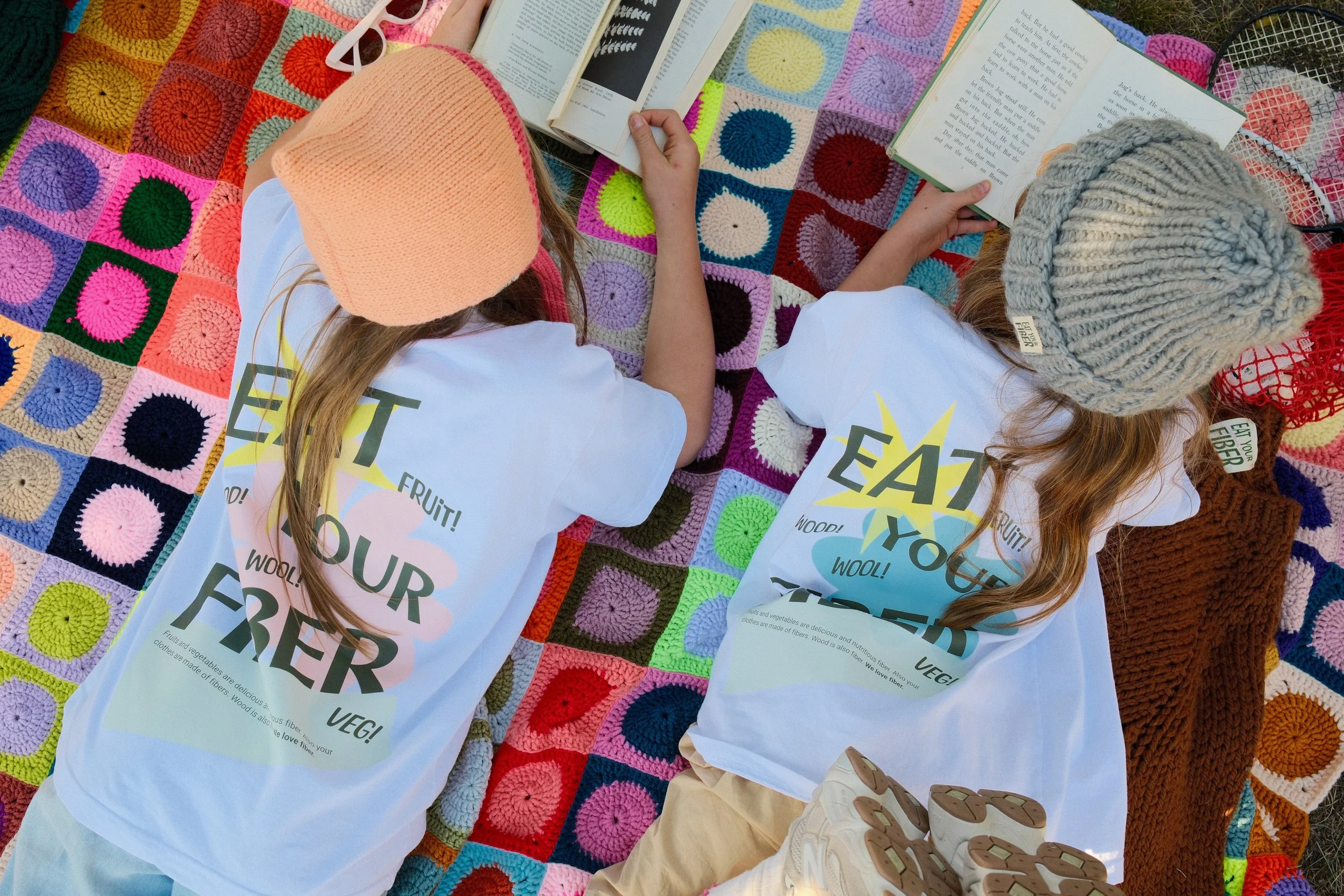 Two children lying on a colorful crocheted blanket outdoors, reading books. They are wearing sunglasses and knit hats, with one child also wearing a dark chunky knit sweater over her shoulders.
